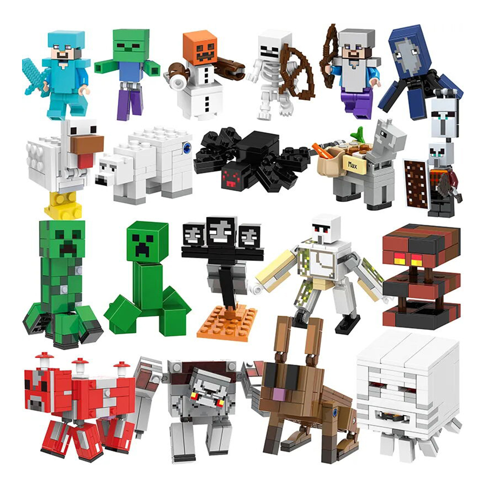 Набор фигурок Майнкрафт, 20 шт совместимый с лего выполнен в стиле игры. Квадратные пластиковые детские мини фигурки совместимы со всеми конструкторами lego и прекрасно добавляют базовые наборы. Коллекционные игрушки для детей выполнены в стиле персонажей игры и имеют соответствующие атрибуты, которые можно вытащить из руки. Набор фигурок лего состоит из 20 основных героев – это Магмовый куб, Железный голем, Белый медведь, Снежный голем, Паук, Маленький крипер, Стив, Скелет, Иссушитель, Стив в алмазной броне, Большой крипер, Спрут, Грибная корова, Курица, Зомби, Гаст, Разбойник, Чудовище Красного Камня, Кролик, Лошадь. Персонажи могут поворачивать руками и ногами.
