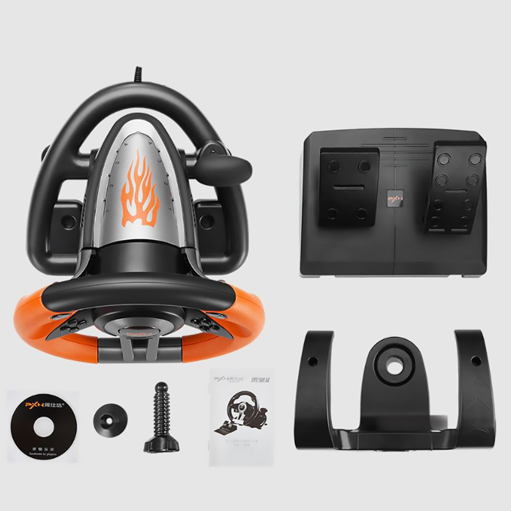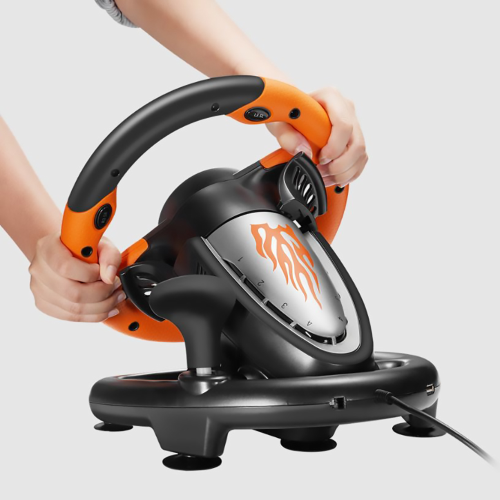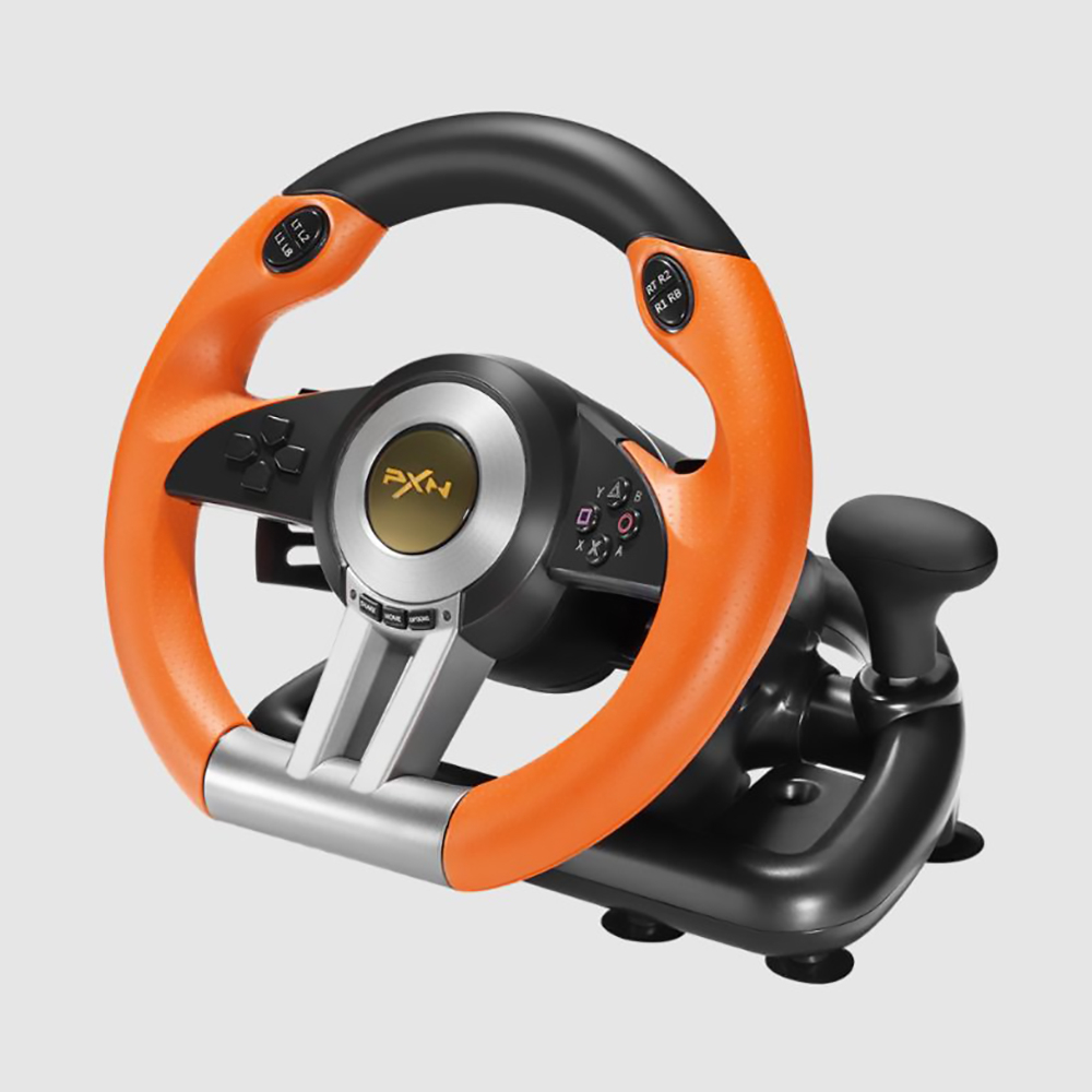 Игровой руль с педалями PXN V3 Pro для ПК, PS3-4, XBox One, Nintendo Switch с реалистичной конструкцией может использоваться в гоночных играх. Контроллер игровой может фиксироваться на горизонтальной поверхности за счет клейких присосок. Игровой руль для компьютера поддерживает обратную связь и вибрацию, которые делают процесс более реалистичным. На руле есть износостойкая прорезиненная оплетка, благодаря которой руки не соскальзывают и держатся крепче. За счет вращения на 90 градусов достигается эргономичность настоящего гоночного руля. В комплекте идут складные педали с функцией газа и тормоза.