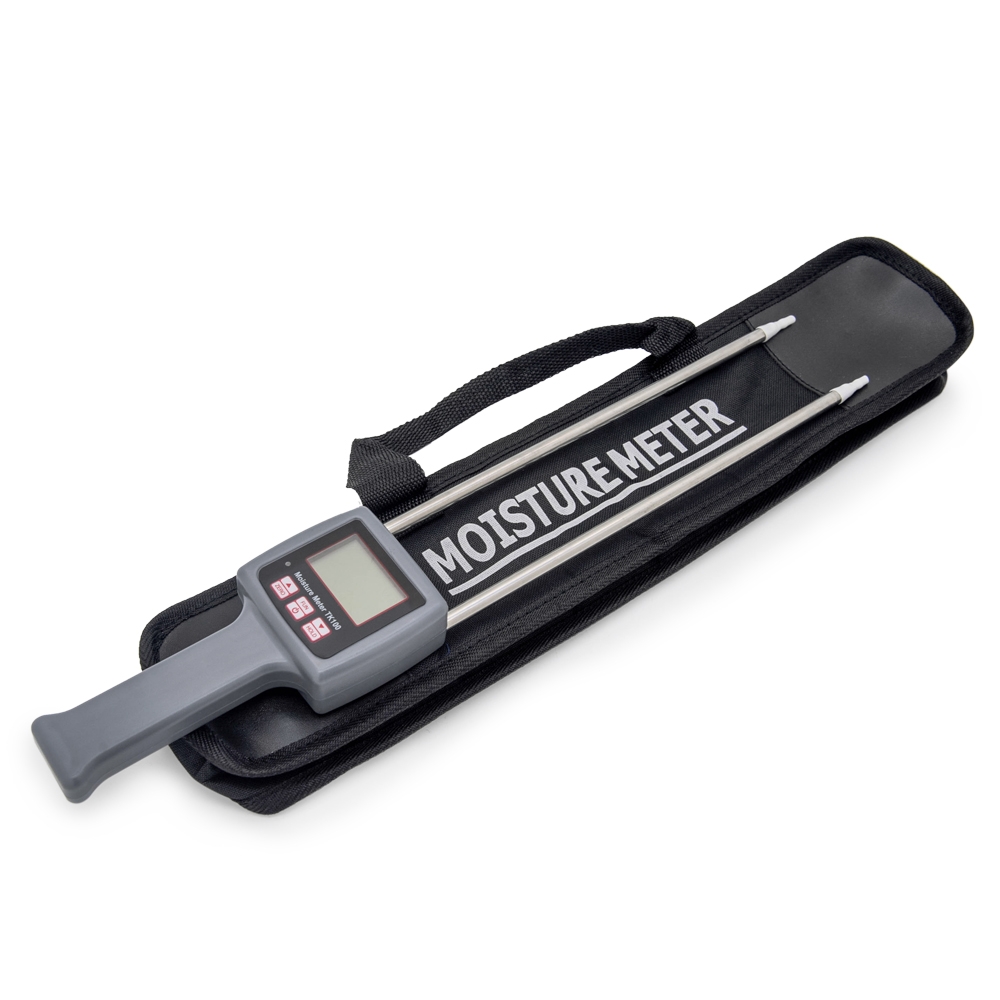 Измеритель влажности с металлическими щупами длиной 30 см. Прибор предназначен для измерения влажности зерна и сыпучих сред в интервале от 5 до 90% с точностью до 0.5%. В диапазоне температур от 0 до 60 градусов действует автоматическая температурная компенсация. Кнопка “HOLD” сохраняет на экране последнее измерение. Питается прибор от четырех батареек формата ААА. Для переноски предусмотрен удобный тканевый чехол.