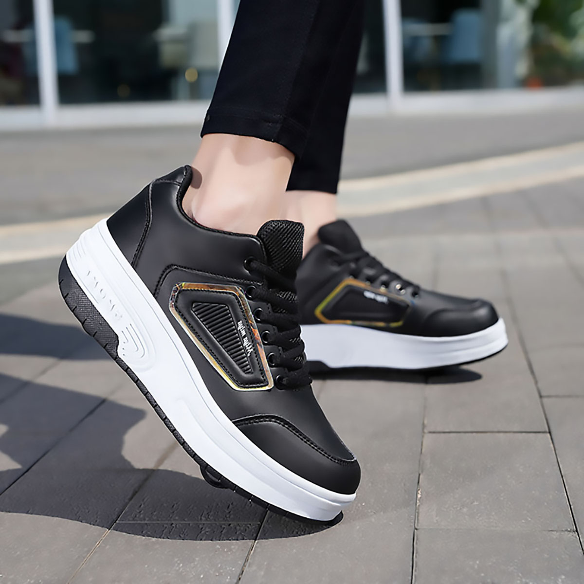 Кеды во съемными роликами 3 в 1: Могут использоваться как двухколесные ботинки, одноколесные ботинки (снимите переднее колесо и добавьте чехол) или плоские кроссовки (удерживайте кнопку за ботинками, чтобы уменьшить заднее колесо и снять переднее колесо).