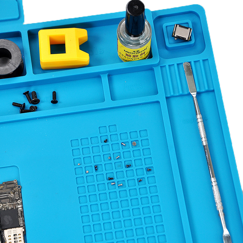 Силиконовый коврик для пайки TERS M9 термостойкий с магнитными ячейками для инструментов устойчив к высоким температурам, коррозии, статическому электричеству и деформации. Термостойкий коврик также можно использовать для работы с клеевыми составами. Большой антистатический коврик оснащен множеством отсеков, в который можно положить материалы и инструменты для пайки и ремонта, а также платы. Есть встроенная линейка 36 см для удобства измерения. При помощи магнитных крепежей можно зафиксировать металлические детали. Огнеупорный коврик надежно лежит на рабочей поверхности и не скользит. Монтажный коврик выполнен из экологически чистого силикона, который выдерживает нагрев до 500 градусов.