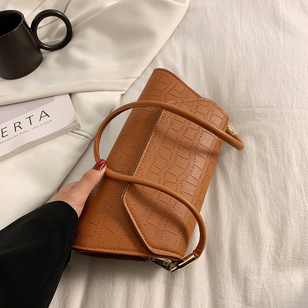 Сумка-багет женская Stella коричневая в форме трапеции – идеальный вариант для выхода на праздничные мероприятия и ежедневной носки. Сумка женская выполнена из белой экологической кожи, которая не требует особого ухода. Мягкая экокожа хорошо переносит холод и жару, не трескается в минусовую температуру, не выцветает под действием ультрафиолета и не боится дождя или снега. Сумка через плечо имеет прочный каркас, поэтому не теряет своей формы. Клапан застегивается на магнитные замки. Длина ручек не регулируется. Прочная хлопковая подкладка не разрывается из-за острых предметов. Внутри сумки-багета есть объемный отсек и небольшой кармашек на молнии для мелочей.